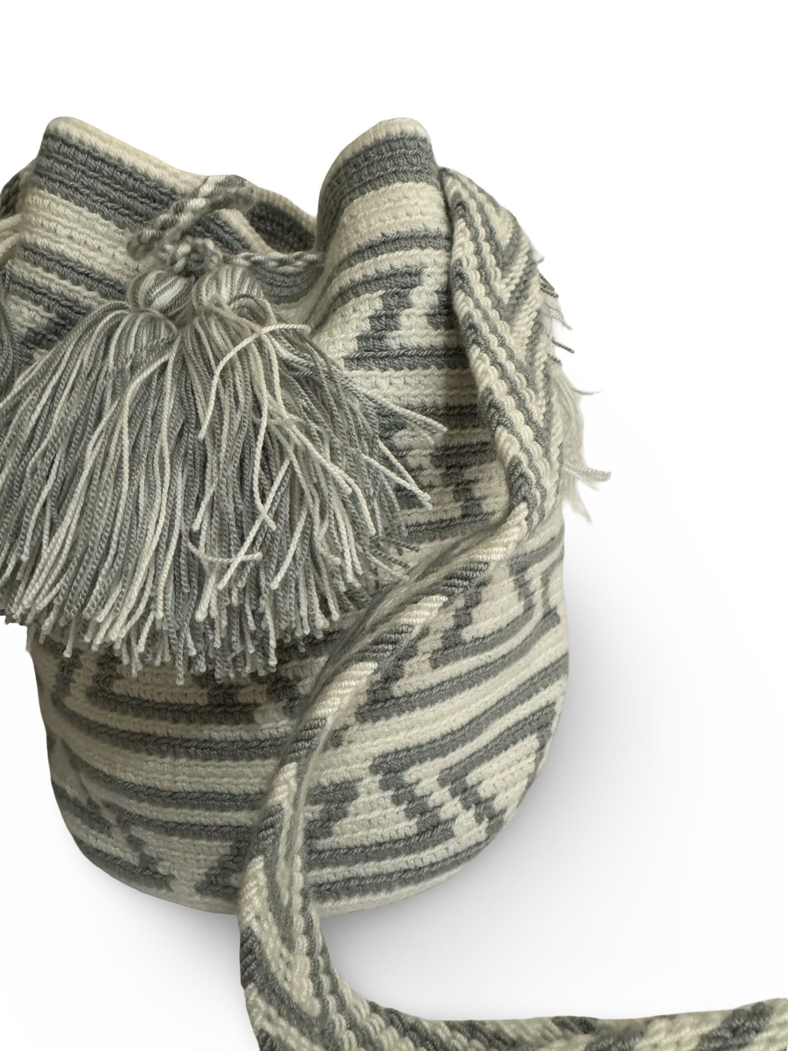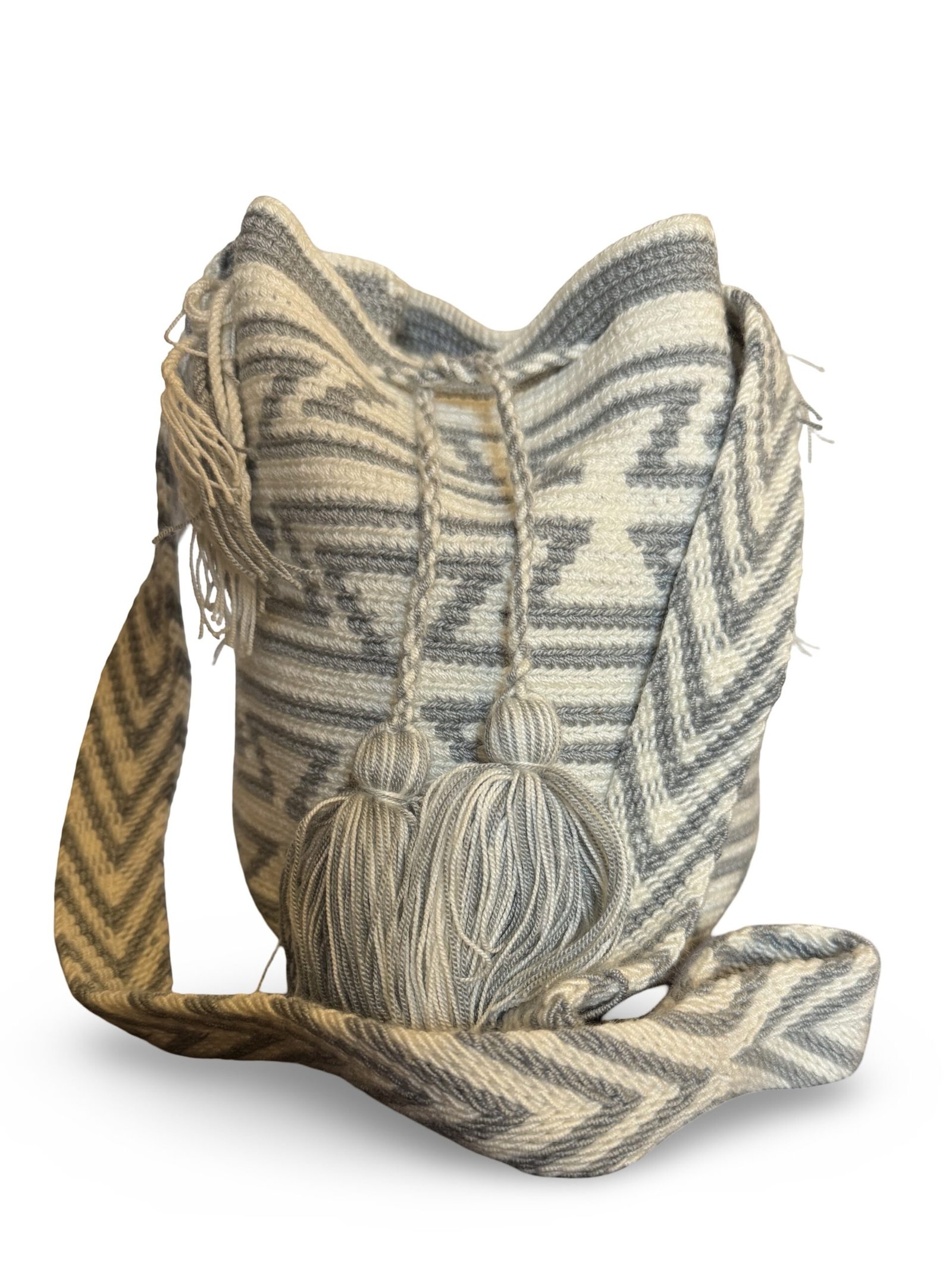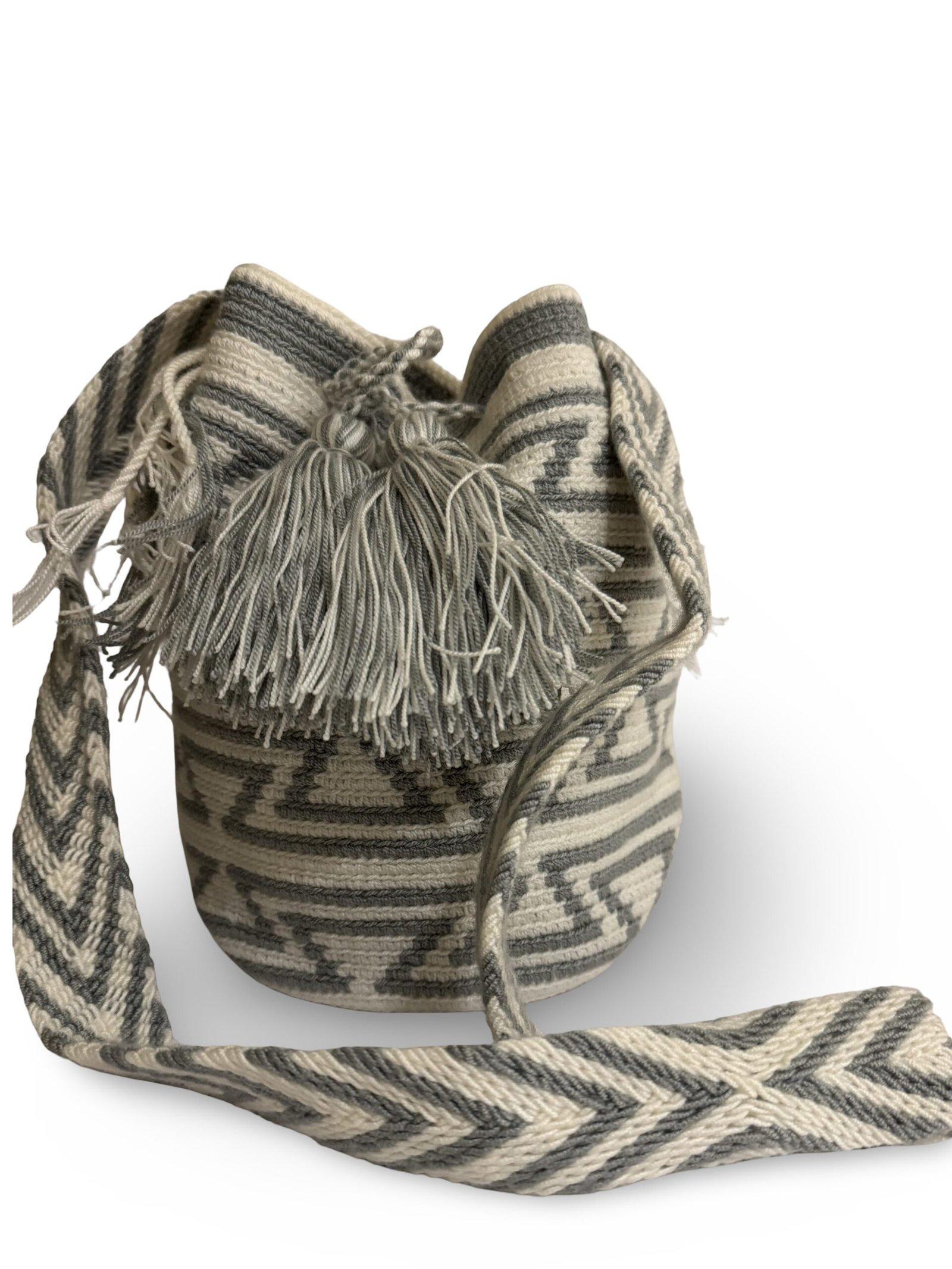 Experience the perfect blend of art, tradition, and modern boho style with this handmade Wayuu bucket bag. This is a crossbody bag, carefully waved in gray and white geometric patterns using traditional techniques by Wayuu artisans of La Guajira region of Colombia. It can take 5-10 days to finish a single mochila bag. Every piece is unique — slight variations make your bag truly one-of-a-kind.