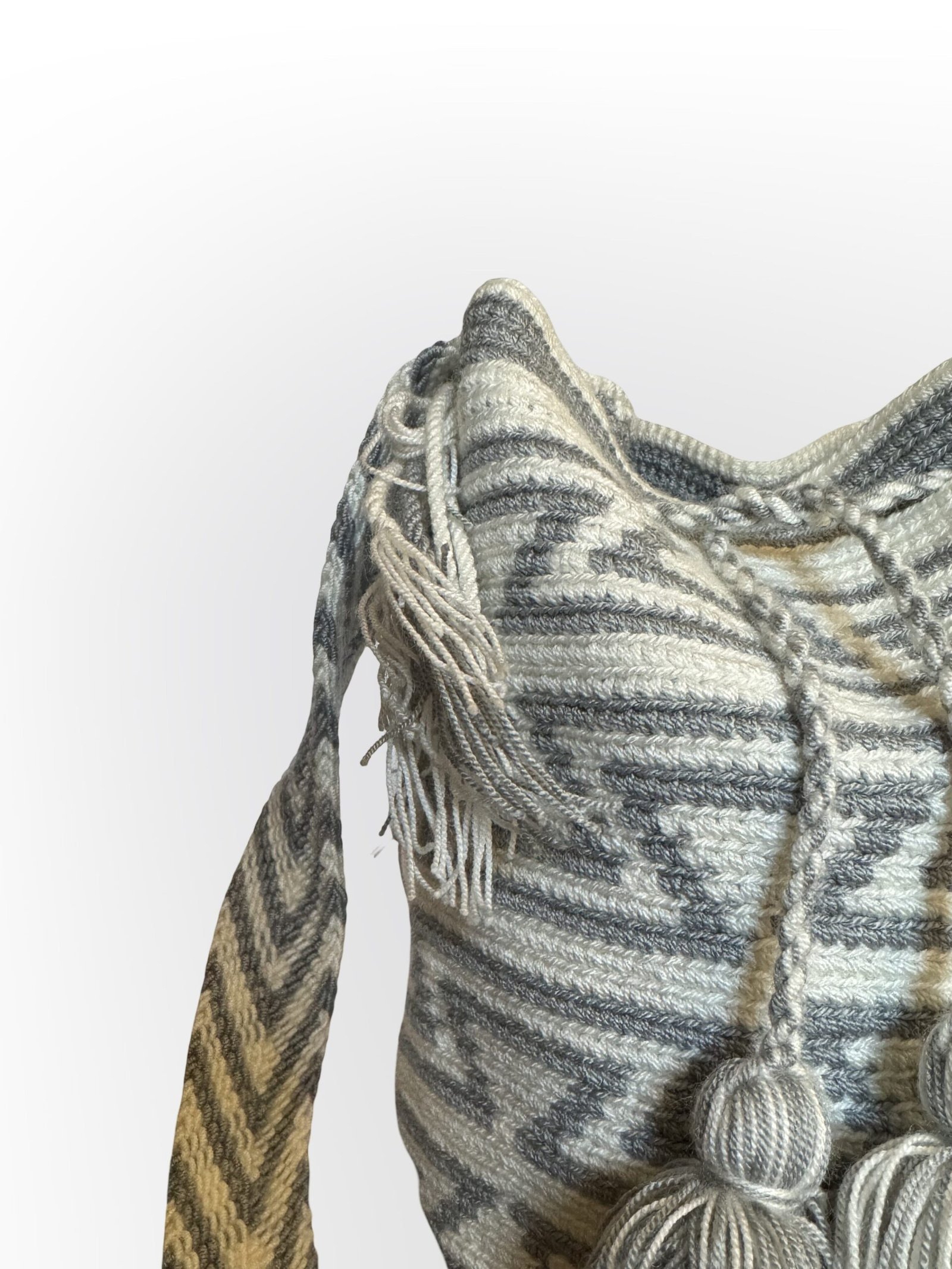 Unique Wayuu Bag- Geometric Pattern Colombian Mochila – Gray&White Crochet Crossbody – Handwoven Stylish Design